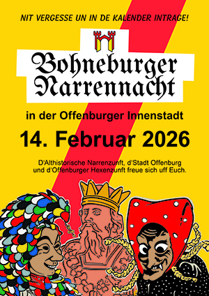 Im Jahr 2024 feierte die Bohneburger Narrennacht am Fasentsamstag ihre Premiere. Schnell stand für die Stadt Offenburg, die Offenburger Hexenzunft e.V. und die Althistorische Narrenzunft Offenburg e.V. fest, dass dies kein einmaliges Projekt sein sollte. Darum wird es auch 2026 wieder die Bohneburger Narrennacht geben!
