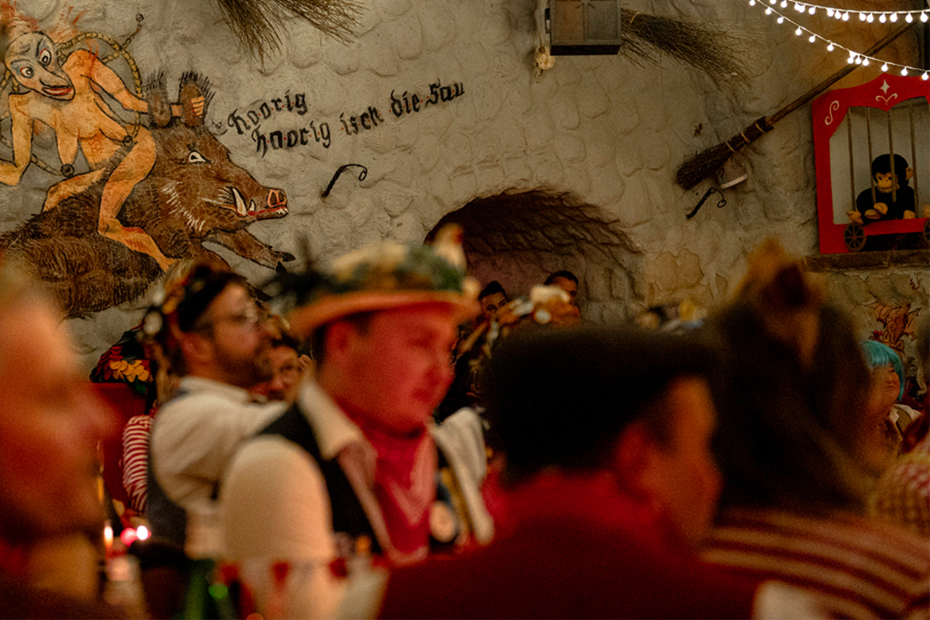 Und um Mitternacht steigt der erste große Hexenspuk, in dem die Neuaufgenommenen dem Ritual gemäß vom Hexenmeister den Hexenstempel „eingebrannt“ bekommen. Jeder Stempelkandidat bekommt vom Teufel in Reimform die Vorzüge und die „Sünden“ seiner Narrenseele vorgelesen. Und es wird dann bekanntgegeben mit welchem Hexennamen er ab sofort angespochen wird. Dieser „Hexennamen“ dient in der Hauptsache dazu, sich gegenseitig unter der Maske anzusprechen, ohne den anwesenden „Zivilisten“ sein wahres Ich bzw. seinen Namen erfahren zu lassen. Nach dem dann folgenden Hexenschwur auf die Zunft und ihre Regeln, wird der nun neu aufgenommene bei einem kleinen Umtrunk natürlich auch noch „von innen“ getauft.